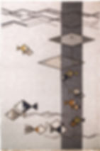 A sign of contemporaneity is the representation of the concept of movement: the arrangement of groups of elements of different sizes and grouped in small quantities gives the carpet the rhythmic sense, from the slow movements of the large fish or stingrays, and the almost schizophrenic one of the small jerky fish.